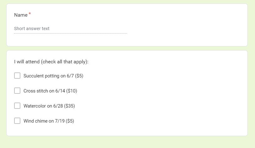 Columns A through C were pre-populated by the Google Form with the timestamp, name, and sessions signed up for. I added a column to add up how much each person owed depending on what they signed up for (column D), a column to track when payments were received and what type of payment (column E), and then next four columns (columns F through I) allowed to keep an easy count of how many people signed up for each workshop. These columns were super helpful when trying to figure out how many supplies to purchase for each workshop.